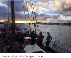“Het is nog steeds super tof hier. We gaan nu inderdaad een ruiger stuk in dan eerst. We zijn gisteren vertrokken uit Bermuda. Het was daar super duur, en ik vind het heel jammer dat we daar zo snel weg zijn gegaan. We waren er veel te kort. Jet is op Bermuda weg gegaan zoals afgesproken, maar toch Super jammer! We hebben 1 dag vrije tijd gehad en voor de rest veel aan school gewerkt nu we stil lagen. Voor we vertrokken hebben we uitleg gekregen over het nieuwe deel van de reis. Het weerbericht ziet er goed uit, maar we moesten wel een paar voorzorgsmaatregelen nemen. We moeten bijvoorbeeld altijd 7 tuigjes in de salon en 7 tuigjes boven bij de wacht hebben. Als het dan te slecht weer wordt, kan je altijd met je hele wacht een tuigje aan en kan je via de lijnen over de boot naar voren en achter lopen. We kregen ook een paar dingen te horen die we wel en niet moeten doen als we bv in een zware storm komen. Het klinkt allemaal heel spannend maar tot nu toe is het nog super rustig op zee. Ik heb helemaal geen last van zeeziekte en heb keihard aan school kunnen werken. Het gaat nu een stuk beter. Ik ga straks maar een toetsje wiskunde maken. We hebben nu nieuwe hutten. We mochten zelf kiezen wat de indeling werd! Dat was nog een geode, omdat Sam niet wilde dat er iemand naast de boot zou vallen (niet letterlijk haha). Daarom moesten we eerst een indeling maken en dan ging hij dat wel of niet goedkeuren. Ik slaap met Koen, Lennard en Jeroen in een hut. Ik heb nu een groot bed en dat slaapt behoorlijk fijn. De wachtindeling is ook super gezellig. Ik heb geen stomme 9-1 wacht meer. Die ga ik dus ook niet meer krijgen. Ik heb een 5-9 wacht wat ik echt heel fijn vind. Nu kan ik lekker brood bakken. Ik wilde leren echt goed broodbakken. Ik zit nu bij Pim in de wacht en